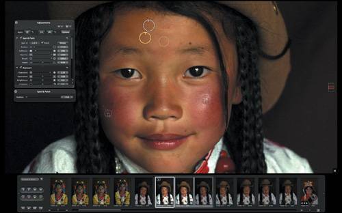 You can also increase the radius of the patch, and the opacity, angle, and detail of the spot and patch, using the controls in the Adjustments HUD. To access the properties of an earlier spot or patch, simply click the circle and change the parameters in the HUD. Experiment with the patch controls until you're satisfied with your retouching work on the freckle.