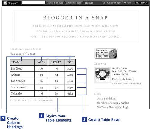 24. Creating Tables in Your Posts SEE ALSO 31 Defining and Implementing Custom Styles While blogging, you might encounter a time when you want to present text that isbest displayed in a table format. The Blogger post editor does not contain a table creation wizard, but a basic table contains only a few elements and its syntax is easy to understand. The following steps show how to create a basic table in HTML. You can follow along by logging in to Blogger and clicking the New Post icon in the Blogs section of the Blogger Dashboard. 24. Creating Tables in Your Posts  1. | Stylize Your Table Elements