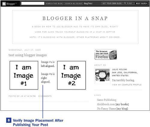 When you have completed the publishing process, take a look at your blog post. Are the images aligned properly? Do they fit? If you are unhappy with your image placement, remember you can simply edit your post and republish itthe images will have been uploaded once, and there will be no need to go through the image upload process again.