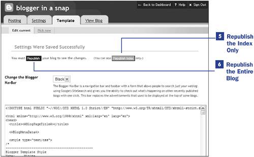 If you make style sheet modifications, which tend to be applicable to all pages within your blog, or if you make other structural modifications to the content area or your sidebar, click the Republish Entire Blog button. All the pages of your blog will be refreshed with the new template in place.
