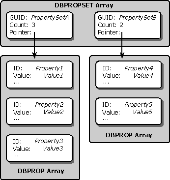 - Store the GUID for each property set in the appropriate DBPROPSET structure. The provider then stores a pointer to the corresponding DBPROP array, along with the number of elements in the array, in the same DBPROPSET structure.