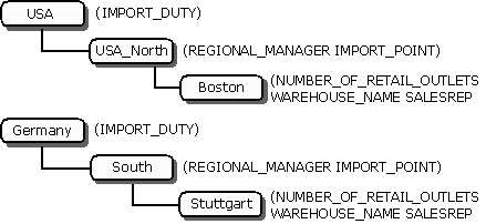 Each piece of data in any given level can have properties assigned to it. In the SalesRep dimension, there is usually a need to store additional data about each salespersonfor example, data such as Address or Phone Number. Therefore, to store this data, each level of a hierarchy tends to have a different set of properties, while all members in a given level have the same set of properties. For example, consider the Geography dimension: Each city can have the properties NUMBER_OF_RETAIL_OUTLETS, WAREHOUSE_NAME, and SALESREP, but these properties might not apply at the Region level. Instead, a region might have properties such as REGIONAL_MANAGER and IMPORT_POINT.