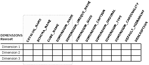 A schema rowset for a given metadata object has one row for every instance of that object present in the schema. For example, if there are five cubes available in the schema, the CUBES rowset has five rows. Each column of a schema rowset provides one piece of information about that object. As shown in the following table, the CUBES rowset has 11 columns, each of which provides a different piece of information about the cube.
