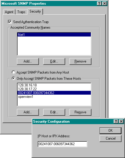For security, the SNMP agent must be configured to know what management station or stations to which it should report status information. The SNMP service uses host names, IP addresses, or IPX addresses to identify valid hosts to which it reports information and from which it receives requests.