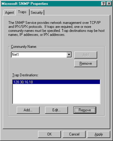 Like most SNMP agents, the Windows NT SNMP service uses community names to authenticate messages. The community name on the NMS must match the community name on the SNMP-managed host. An SNMP agent can be a member of multiple communities at the same time, allowing for communications with SNMP managers from various communities. The computer name, IP address, or IPX address of all NMSs in a community that will receive and be allowed to send SNMP commands may be specified when configuring the SNMP service. In Figure 7-16, the Net1 community contains four NMSs that are authorized to manage this computer.