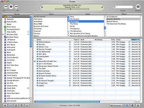 Figure 16.10. The Browser offers a good way to find songs in your Library.  The contents of the "path" selected in the Browser are shown in the Content pane that now occupies the bottom part of the right side of the window. At the top of each column is the All option, which shows all the contents of that category. For example, when All is selected in the Genre column, you will see the contents of all the genres for which you have music in the Library. In Figure 16.10, you can see that I have selected All in the Genre column, Phil Keaggy in the Artist column, and Acoustic Sketches in the Albums column. This causes the Content pane to show all the tracks of album titled Acoustic Sketches by Phil Keaggy in the Content pane.