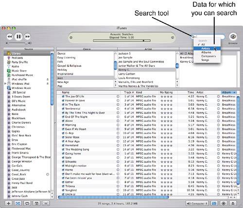 | To make the browse results less narrow again, select All in one of the Browser's columns. For example, to browse all your music again, click All in the Genre column. Hopefully, you can see that you can use the Browser to quickly scan your Library to locate music you want to hear or work with. As you use the Browser more, you will come to rely on it to get you to a group of songs quickly and easily. Searching Your Music Library You can use iTunes Search tool to search for specific songs. You can search for songs by any of the following criteria: To search for music in your Library, perform the following steps: 1. | Select the source you want to search (for example, click the Library source). As you might surmise, you can search any source in the Source list such as a CD, playlist, and so on by selecting it and then performing a search.