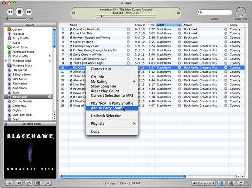 As the Party Shuffle plays, you can keep moving upcoming songs around to change the order in which they will play. You can also press the right-arrow key to skip to the next song. In addition, you can manually add songs to the Party Shuffle. View a source to find the song you want to add. Open the song's contextual menu by right-clicking it (see Figure 18.17). Select Play Next in Party Shuffle to have the song play next, or select Add to Party Shuffle to add the song to the end of the upcoming songs list. Figure 18.17. To add a song to the Party Shuffle, use one of the Party Shuffle commands on its contextual menu.  The Absolute Minimum Playlists are a great way to customize the music in your Library for listening purposes, to create a CD, or to manage the music on an iPod. As you learned in this chapter, playlists include a specific collection of songs that you choose, whereas iTunes chooses the songs in a smart playlist based on the conditions you specify. Playlists are a great way to select specific music to which you want to listen. You can make them as long or as short as you like, and you can mix and match songs to your heart's content. Use the Party Shuffle playlist to spice up your music experience by keeping it fresh. Smart playlists can really enhance your listening experience. Following are some ideas you might find interesting for your own smart playlists: Be diligent about rating your songs. Then create a smart playlist for one of your favorite genres that also includes a rating condition. Enable this playlist to be updated live. Such a playlist would always contain your favorites songs in this genre, even as you add more songs to your Library. Create a smart playlist based only on genre and allow it to be updated live. This playlist would make it easy to listen to that genre, and it would always contain all your music in that genre. Create a smart playlist that includes several of your favorite artists (remember to choose Any in the top menu) and limit the number of songs to 20 or so. Have iTunes select the songs in a random order. Playing this playlist might provide an interesting mix of music. If you include a My Rating condition, you can cause only your favorite music to be included in this group. Make a dynamic list, and it will change over time as you add music to your Library. Create a smart playlist for your favorite artists and allow them to be updated live. As you add music by the artists to your Library, just play the related playlist to hear all the music by that artist, including the new music you add. If you like to collect multiple versions of the same song, create a playlist based on song name. Allow it to be updated live, and this playlist will contain all the versions of this song you have in your Library.