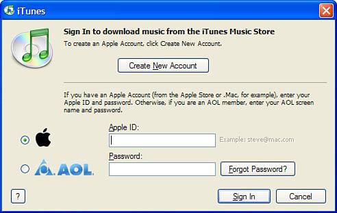 Figure 24.6. You can sign in to your iTunes Music Store account by entering your Apple ID or AOL account information in this dialog box.