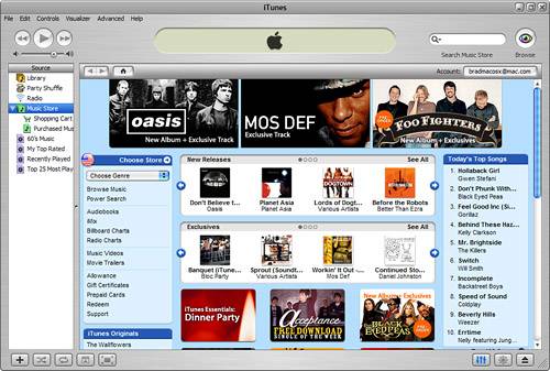 Figure 24.5. When your iTunes Music Store account appears in the Account button, you are logged in to your account and can start shopping for tunes.