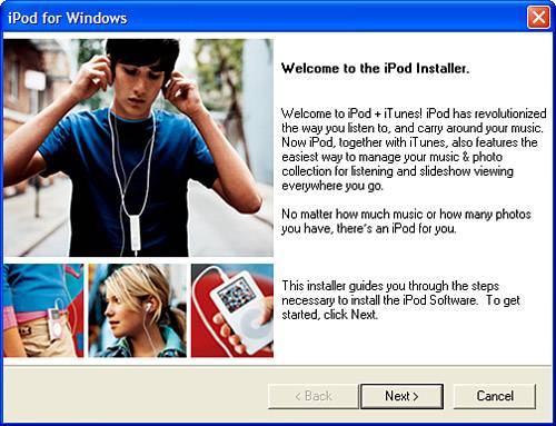 After you click OK, the InstallShield Wizard window will appear, and you can watch the initial installation process. When that is complete, you will see the iPod for Windows dialog box (see Figure 2.1). This dialog box might have a slightly different title depending on the iPod model you have, but it will work in the same way.