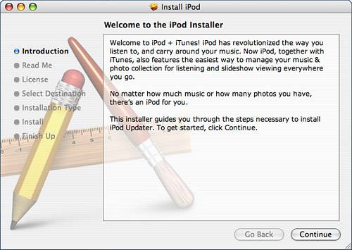 Figure 2.2. This is the initial screen of the iPod installer on a Mac.