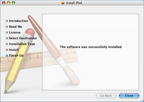 | 13. | Click Close. The installer will quit, and the iPod Updater application will launch. To update the iPod's software, you will need to connect the iPod to your computer. You'll learn how to do that in the next section.