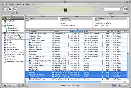 | 3. | Drag the songs you want to place on the shuffle from the Content pane onto the shuffle's icon. When the pointer is over the shuffle, its icon will be highlighted. Release the mouse button and the songs will be copied onto the shuffle (see Figure 6.14).