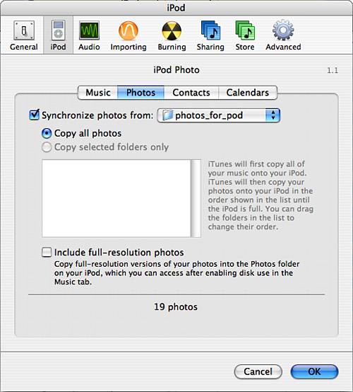 tip  | You can use an iPod to back up your photo files by checking Include full-resolution photos. Each time you synch your iPod, copies of your photo files will be placed on your iPod. If you ever need to recover them on your computer, you can use the iPod as a disk to do so. |