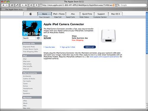 | Moving Photos from a Digital Camera onto an iPod Using the iPod Camera Connector accessory (available at the online Apple Store), you can connect the USB cable you use to transfer images from your digital camera to your computer to also transfer them onto an iPod (see Figure 9.3). In addition to being able to view those images on the iPod, you can also transfer them from the iPod to your computer. Figure 9.3. Using the iPod Camera Connector, you can transfer images directly from a digital camera onto an iPod.  tip  | This is a great way to expand the number of images you can capture without a computer. If you fill up your camera's memory card, you can move the images on that card to the iPod, erase the card, and then shoot more photos. |