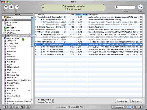 | 5. | Click OK. Your iPod will be updated according to the options you selected. Each time your iPod is updated, your podcasts will be too.