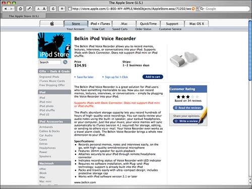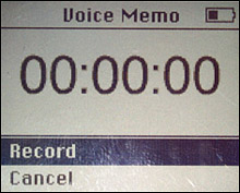 Choosing a Voice Recorder for an iPod To record sound on an iPod, you need to obtain a voice recorder accessory. At least two of these units are available: the Belkin iPod Voice Recorder and the Griffin Technology iTalk iPod Voice Recorder. The Belkin unit is the one I focus on here (see Figure 11.12). This unit retails for about $35 and enables you to access the recording features that are already built in to the iPod's software. Figure 11.12. The Belkin iPod Voice Recorder enables you to use your iPod to record your voice and other sound.  Installing the Belkin iPod Voice Recorder Installing the Voice Recorder couldn't be easier. Simply plug the unit into the iPod's Headphones and Remote ports. When you do so, you'll see the Voice Memo screen (see Figure 11.13). That's all there is to setting up the Voice Recorder. Figure 11.13. When you connect a Voice Recorder to your iPod, you'll see this Voice Memo screen.