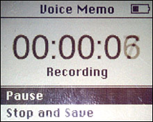 | 2. | Highlight Record and press the Select button. Your iPod will begin recording, and the counter on the Voice Memos screen will begin counting the time of the current recording. At the same time, the Pause and Stop and Save commands will appear on the screen (see Figure 11.14).