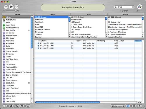 Working with Sound You Have Recorded There are a number of things you can do with sounds you have recorded. These include the following: You can play sounds you have recorded by highlighting the sound you want to hear on the Voice Memo screen and pressing the Play button. You'll see the Now Playing screen, and the sound will play. You can delete sounds you have recorded by highlighting the sound you want to delete and pressing the Select button. You'll see a screen with Play and Delete options. Select Delete and then select Delete Memo on the resulting screen. The sound you recorded will be deleted. The next time you connect your iPod to your computer, the sounds you recorded will be uploaded into your iTunes Library. To find them, search for the dates on which you recorded the sounds; the sounds you recorded on those dates will be shown in the Content pane (see Figure 11.16). After a recorded sound is in your Library, you can work with it just like the songs in that Library. For example, you can play the sounds, add them to playlists, put them on CD, and so on. Figure 11.16. These are sounds I recorded on an iPod.