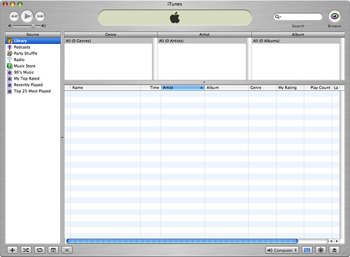 Figure 14.8. There aren't any songs in the Library yet, so this iTunes window looks a bit boring; we'll soon fix that!