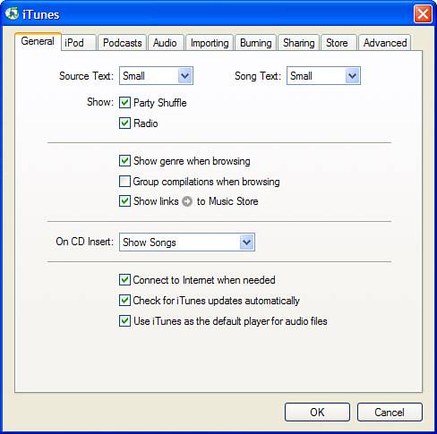Setting General iTunes Preferences On the General pane of the Preferences dialog box are several settings you might want to use (see Figure 15.14): Source Text Use this drop-down list to change the size of the font of the sources shown in the Source list. The options are Small (default) and Large. Song Text This setting changes the size of the text used in the Content pane. Again, your options are Small and Large. Show Party Shuffle and Radio check boxes Earlier, you learned how to work with the Radio source. If you don't want that source to be shown, uncheck the Radio check box. The Radio source will be removed from the Source list and you won't be able to see it. Similar to this, you can uncheck the Party Shuffle check box to hide that playlist (you'll learn about this special playlist later in this part of the book). Show genre when browsing If you read the previous chapter, you learned about the Browser. This check box controls whether the Genre column appears in the Browser (the check box is checked) or not (the check box is not checked). I like the Genre column, so I leave this checked, but if you don't, you can uncheck the check box to remove that column from the Browser. Group compilations when browsing Compilations are what iTunes calls CDs that contain music from various artists (you know, like that Greatest TV Theme Songs from the 1970s CD you like so much). If you check this check box, these compilations will be grouped as collections of music even though the artists might be different on one or more tracks. If you don't want your compilations grouped and prefer to have each track be grouped by artist, uncheck the check box. Show links to Music Store When this is checked, arrow buttons will appear next to songs, artists, and albums in the Content pane and in other locations. When you click one of these buttons, you'll move to related music in the iTunes Music Store. If you don't want these links displayed, uncheck the check box. On CD Insert You learned about this earlier in this chapter and will come back to it in the next. Connect to Internet when needed If you don't want iTunes to try to connect to the Internet automatically, such as when you are using it on a laptop, uncheck this check box. Because iTunes uses the Internet to get CD information, provide Internet radio, and access the iTunes Music Store, you should leave this check box checked whenever you are using iTunes on a computer that can connect to the Internet. Check for iTunes updates automatically This check box controls whether iTunes checks for updates and lets you know when they are available. Because it is a good idea to use the current version, you should leave this check box checked. Use iTunes as the default player for audio files (Windows) or Use iTunes for Internet music playback (Mac) You learned about this check box (Windows) or Set button (Mac) in the previous section. Figure 15.14. The General pane of the iTunes Preferences dialog box provides…, well, general preferences.