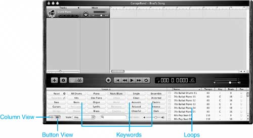 | One of the easiest ways to build a track in GarageBand is to use its loops. These loops make it easy to create great sounding music, especially for rhythm, percussion, and other "texture" elements. There is a huge variety of loops you can use in GarageBand so even though you are using music someone else has created, your personal creativity isn't limited at all because you can configure and mix these loops in an endless variety of ways. Finding Loops to Use There are a number of different ways to find loops that you might want to use in your project. Finding Loops Using the Loop Browser in Button View As you can probably guess from its name, the Loop Browser enables you to browse available loops. To use the Loop Browser to find a loop, perform the following steps: 1. | Click the Loop Browser button (the third button from the left along the bottom of the GarageBand window, refer to Figure 20.2). The Loop Browser will slide open and you will see the collections of loops available to you (see Figure 20.3). By default, the Loop Browser will open in the Button view.