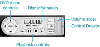 The Controller window contains the controls you use to watch movies. It has two orientations, which are vertical and horizontal. It is in the horizontal mode by default (see Figure 25.2). You can change the orientation to vertical by selecting Controls, Use Vertical Controller. To change the Controller back to the horizontal orientation, select Controls, Use Horizontal Controller. Figure 25.2. The Controller does just what you think: It enables you to control DVD playback.