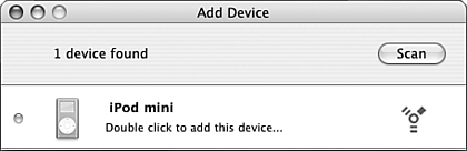| 2. | Choose Devices, Add Device. Your Mac will be scanned for devices to sync. Devices that are found will be shown in the Add Device window (see Figure 27.12).