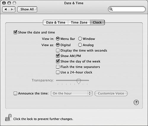 Figure 4.23. The Clock tab of the Date & Time pane of the System Preferences application enables you to customize the clock on the desktop.