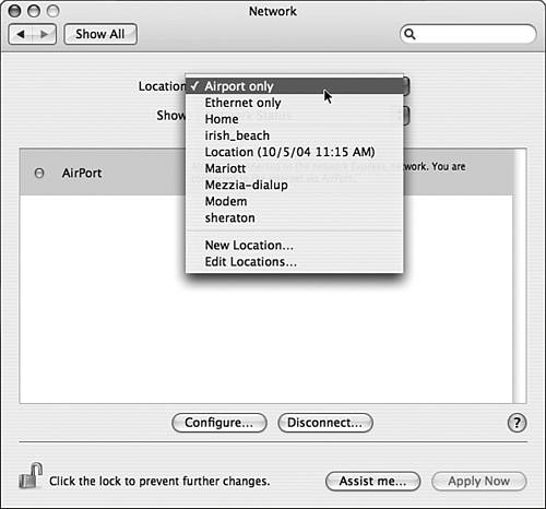 | As you move your mobile Mac around, you will probably want to connect to different networks from different locations. For example, you might use an AirPort network to connect to the Internet at home, an Ethernet network to connect when you are at work, and a dial-up connection when you are on the road. The Mac OS X Location Manager feature enables you to configure multiple network configurations on your Mac. You can then switch among these configurations easily (rather than having to manually reconfigure your Mac each time you change locations). NOTE You can have more than one active port on the same machine, meaning you can have different means of connecting to a network active at the same time (such as AirPort and Ethernet). You don't need to have a location for each active port. You should use locations when you want to have different sets of active ports that you want to be able to switch among easily. For example, suppose you connect to the Internet using Ethernet at your office and at home. But, at the office you have a fixed IP address while at home you use a DHCP server. You can create a location for each situation and easily switch between them by using the appropriate location. Creating a New Location To configure a new network location, use the following steps: 1. | Open the Network pane of the System Preferences application (see Figure 12.6).