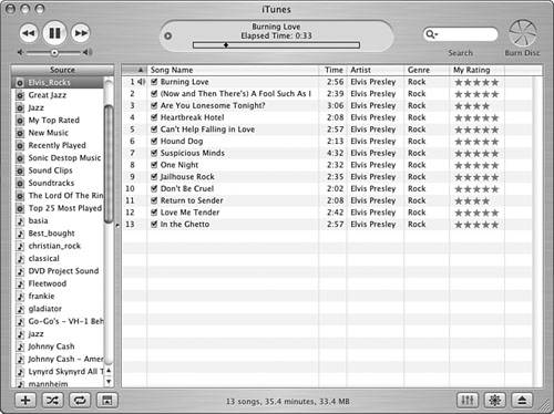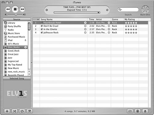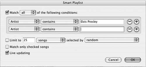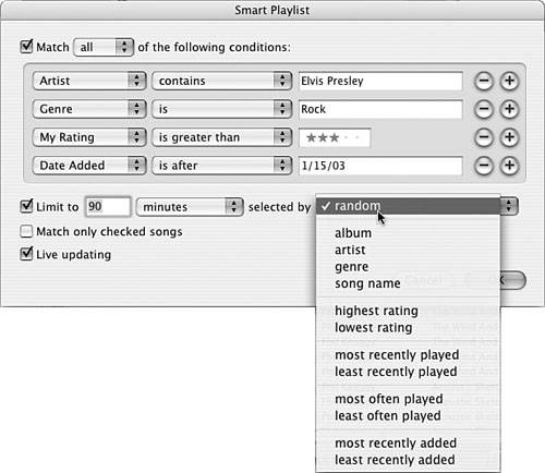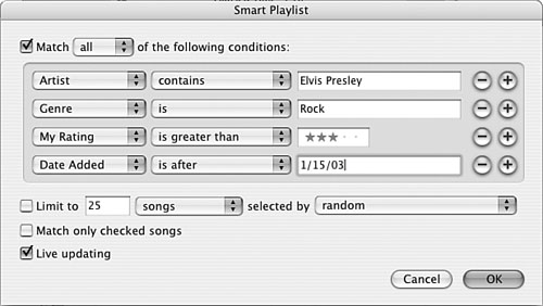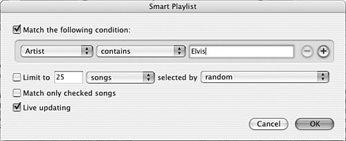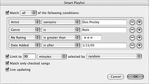 Note  | The smart playlist I built as an example (shown in Figure 16.13) in these steps can be interpreted as follows: Include songs by Elvis Presley in the Rock genre that I have rated at three stars or more and that I added to my Library after 1/15/03. Limit the playlist to 90 minutes, and if I have more songs that meet the conditions than this time limit allows, randomly choose the songs to include. Include only songs I haven't skipped and keep adding songs that meet the conditions as I add them to my Library. | | 19. | Type the playlist's name and press Enter (Windows) or Return (Mac). The smart playlist is complete (see Figure 16.14).