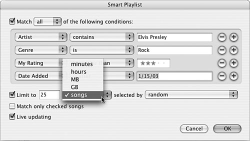 | 12. | Choose the attribute by which you want to limit the playlist in the first menu; by default, this menu has Songs selected (see Figure 16.11). Your choices include the number of songs (songs on the menu), the time the playlist will play (in minutes or hours), or the size of the files the playlist contains (in GB or MB).