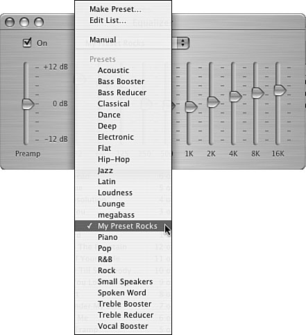 Figure 17.3. Are there enough presets for you?  | 4. | Choose the preset you want to apply. When you return to the Equalizer window, the sliders will be set according to the preset you selected (see Figure 17.4).
