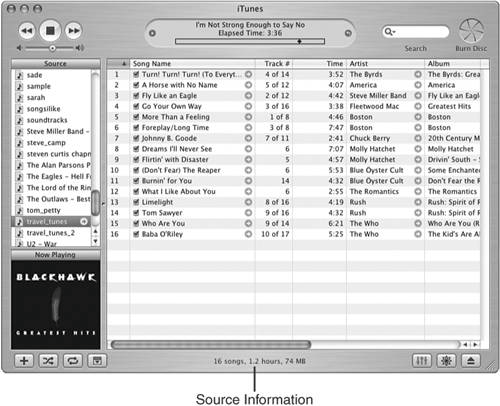 Figure 18.5. iTunes is ready to burn.  | 3. | Insert the appropriate disc into the drive. If you selected the Audio CD or MP3 CD format, use a CD. If you selected the Data format, use a CD or DVD. iTunes will check the disc you inserted. If everything is ready to go, you will see the "Click Burn Disc to start" prompt in the Information area.