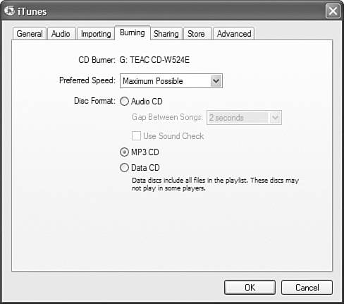 To choose either the MP3 CD or the Data CD or DVD format, simply click the appropriate radio button. Click OK to close the iTunes Preferences dialog box and prepare the burn session. Burning a Disc After you have selected the content and prepared the burning session, actually burning the disc is rather anticlimactic. You burn a disc with the following steps: 1. | Make sure the playlist you want to burn is selected.