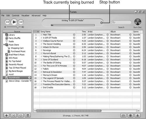 Figure 18.6. The playlist Soundtracks is being put on CD.  When the process is complete, iTunes will play a tone to let you know. The CD will appear on the Source List and will be selected (see Figure 18.7).
