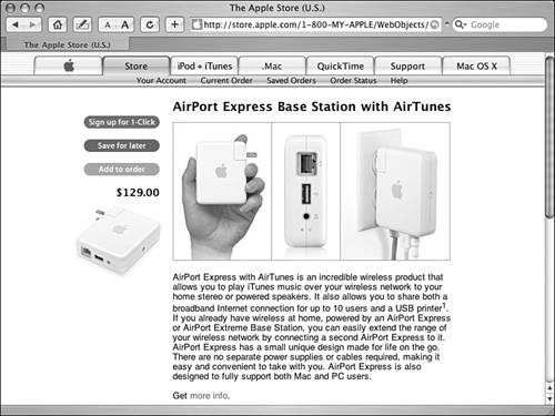 | Obtaining and Installing an AirPort Express You can purchase an AirPort Express at any retail location that carries Apple products, such as the online Apple Store (see Figure 19.8). At press time, an AirPort Express costs $129, which is quite a bargain considering its small size and excellent features. Figure 19.8. An AirPort Express is a full-featured wireless hub that is just slightly larger than a deck of cards.  After you have obtained an AirPort Express, use the installation CD that comes with it to install the AirPort Express software on your computer. Note  | In order to share iTunes music with an audio device using AirPort Express, the computer on which the Music Library resides must have access to a wireless network so that it can broadcast its music to the AirPort Express. |