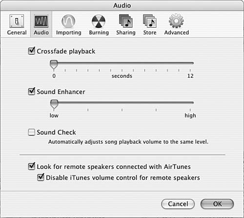 | Configuring iTunes to Broadcast to a Network After your AirPort Express has been configured, you set iTunes to broadcast to it. 1. | Open the Audio pane of the iTunes Preferences dialog box (see Figure 19.9).