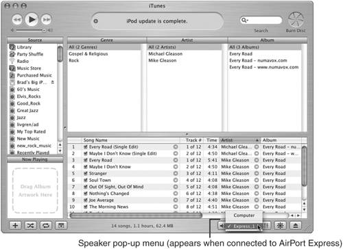 Figure 19.10. By choosing Express_1, music I play will be heard on the audio device (in this case, a pair of powered speakers, connected to the AirPort Express called "Express_1").  | 2. | Play the music you want to hear, such as playlist, CD, your Library, and so on. You'll see a message telling you that iTunes is connected to the selected speakers in the Information area. When that process is complete, music will begin playing over the device to which the AirPort Express is connected.