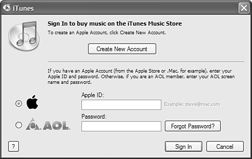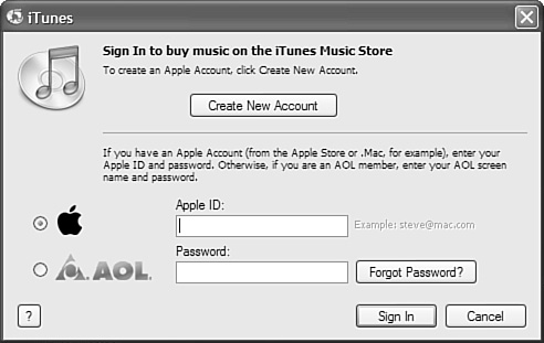 Figure 22.6. You can sign in to your iTunes Music Store account by entering your Apple ID or AOL account information in this dialog box.  Note  | If you just want to browse for, search for, or preview music, you don't have to be logged in to your account. | | 2. | If you use an Apple ID to sign in to the store, click the Apple button (this is selected by default). If you use an AOL account to sign in, click the AOL button.