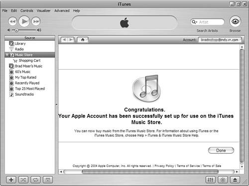 | 7. | If you are prompted to enter any additional information, do so and click the Continue or Done button. When the process is complete, you will see a completion screen. You will then be logged in to your new account (see Figure 22.5). Click Done. You will return to the iTunes Music Store and you can start shopping.