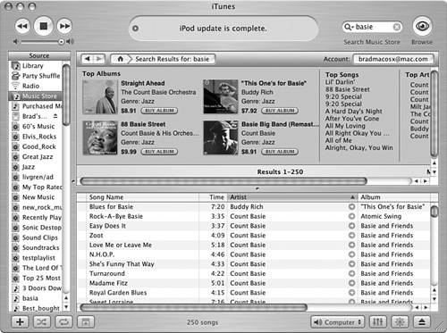 Figure 23.7. In this search, I found all the music in the store with "Basie" as the artist.  | Tip  | To clear a search, click the X button in the Search tool. |