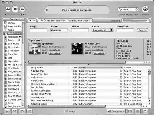Figure 23.9. Here I have searched for music with the artist "Chapman" in the Inspirational genre.  | Just like a basic search, after you have performed a power search, you can click the albums to view their contents, preview songs, purchase albums or songs, and so on. |