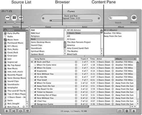 | The required but mundane work of installing iTunes on your computer is done. Now, let's take a quick tour so you get the overall feel of this excellent application. In the following chapters, you'll get down and dirty (well, because we are dealing with electrons here, there isn't really any dirt) with the details. Seeing Through the iTunes Window The iTunes window, like the windows on your house, consists of a number of panes (see Figure 12.9). Let's take a quick look at each of these. Figure 12.9. Working with iTunes panes won't cause you any (pain, that is).  On the far left of the iTunes window is the Source List. On this list, as you might suspect from its name, are the sources of music with which you can work. To work with a source, such as a CD or the iTunes Music Store, you select it by clicking it. When you select a source, its contents will appear in the Content pane and Browser (if you have the Browser open for a selected source). In Figure 12.9, I have selected the Library as the source; its contents are shown in the Browser at the top of the window while the list of individual songs that make up the Library is at the bottom of the window. Note  | Different sources have different icons in the Source List. For example, the Library has a yellow box containing a music note, whereas playlists have a blue box with a musical note. |