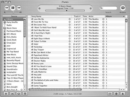 You will use many types of sources, including the Library, the Radio, the iTunes Music Store, audio CDs, playlists, and more. As we work though the rest of this part of the book, you will get experience with all these kinds of sources. The Browser presents the contents of the selected source at a summary level, by genre, artist, and album. You can view the contents of the selected source by clicking it in the appropriate column. For example, in Figure 12.9, I have selected the Rock genre. The Artist column then shows all the artists whose music I have in the selected genre. The Album column shows all the albums for the selected artist. The Browser can be shown or hidden. For example, take a look at Figure 12.10, which shows the iTunes window with the Browser hidden. Figure 12.10. Where, oh where, has my Browser gone? Where, oh where, can it be?  At the bottom of the iTunes window (or filling it if the Browser is hidden) is the Content pane. This area lists each song in the selected source. For each song, you will see a variety of information, such as Song Name, Track #, Time, Artist, and so on. You can choose the information you see on this list to make it contain the information you find the most useful. The order in which songs are listed in the Content pane is the order in which they will play when you play the selected source. Tip  | We will get to working with the Browser later, but for now know that you can open and close it by clicking the Browse button or by choosing Edit, Show Browser or Edit, Hide Browser. |