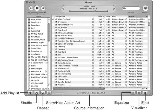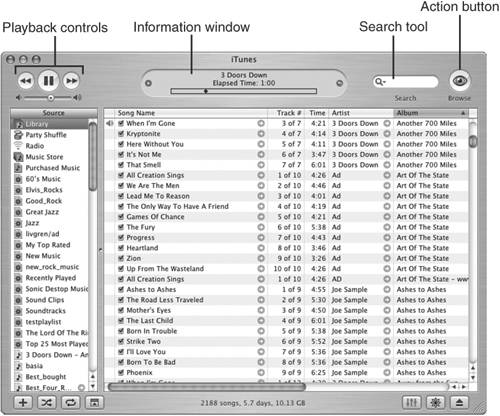 Going back to Figure 12.9, you can see that several songs by the group 3 Doors Down are listed in the Content pane. Controlling Your Music Surrounding those panes are the controls you use to work with and get information about your music. At the top of the window, from left to right, you will see the following areas (see Figure 12.11): Figure 12.11. At the top of the iTunes window, you see a number of controls you can use to play and manage your music.  Playback controlsHere, you can see the familiar Play/Stop, Fast Forward, and Rewind buttons along with the Volume Control slider. These work as you probably expect them to. Information windowIn the center of the iTunes window is the Information window. In this area, you will see a variety of information about what you are doing at any point in time. For example, when you are playing music, you will see information about the music currently being played. When you import music, you will see information about the import process. Later, you'll learn how to choose the information displayed here. Search toolYou use the Search tool to search for music. Action buttonThe Action button changes depending on the context you are in. For example, if you have selected the Library, it becomes the Browse button, which you use to open or close the Browser. If you select a playlist, it becomes the Burn button, which enables you to burn a CD. When you move to the bottom of the iTunes window, you will see the following (see Figure 12.12): Figure 12.12. Not to be outdone by the top, the bottom of the iTunes window is chock full of good stuff, too.  Note  | Because I don't see much value (not even entertainment value) in the Visualizer, I won't be mentioning it again in this book. You can play with it by using the Visualizer menu if you want to. Oh, by the way, the images you see in the Visualizer are not related to any music that might be playing anyway. Want proof? Fire up the Visualizer with no music playing; it looks just like it does when music is playing. |