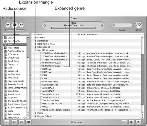 Note  | When you view the Content pane with Radio source, Stream provides the names of the channels available to you. Bit Rate is a measure of the quality of a channel. The higher the bit rate, the better the quality, but the higher bandwidth connection you need to play it successfully. The Comment column contains a description of each channel. | | 2. | Click the expansion triangle for the genre in which you are interested (see Figure 13.10). iTunes will connect to the Internet to update the list of channels for the genre you selected, and the genre will expand. You will see the various channels it contains. Look at the stream name, bit rate, and comment for the channels to decide which you want to try. Usually, the comment will provide a description of the kind of music the stream contains.