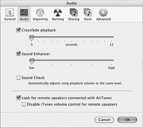 Sound CheckThis effect sets the relative volume level of all songs the same. It is useful if you have changed the relative volume level of songs (perhaps you cranked up your favorite classical tunes) and want to have all your music play at the same volume level. To implement this effect, check its check box and click OK. AirTunes SettingsYou can use the AirPort Express Base Station to broadcast your iTunes music over a wireless network (this is called AirTunes). You'll learn about using this cool feature in Chapter 19, "Sharing iTunes Music over a Network." You use the bottom two check boxes in the Audio preferences pane to turn the AirTunes feature on and to disable the iTunes volume control for the remote speakers. Note  | You'll learn how to change the relative volume level of songs later in this part of the book. |
