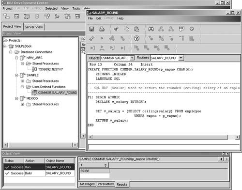 This function takes an employee number as input and returns the salary rounded to the highest integer value. SQL functions can be developed by using the Development Center, as illustrated in Figure 7.29. Figure 7.29. Using the Development Center tool to develop, test, and run the csmmgr.salary_round user-defined function